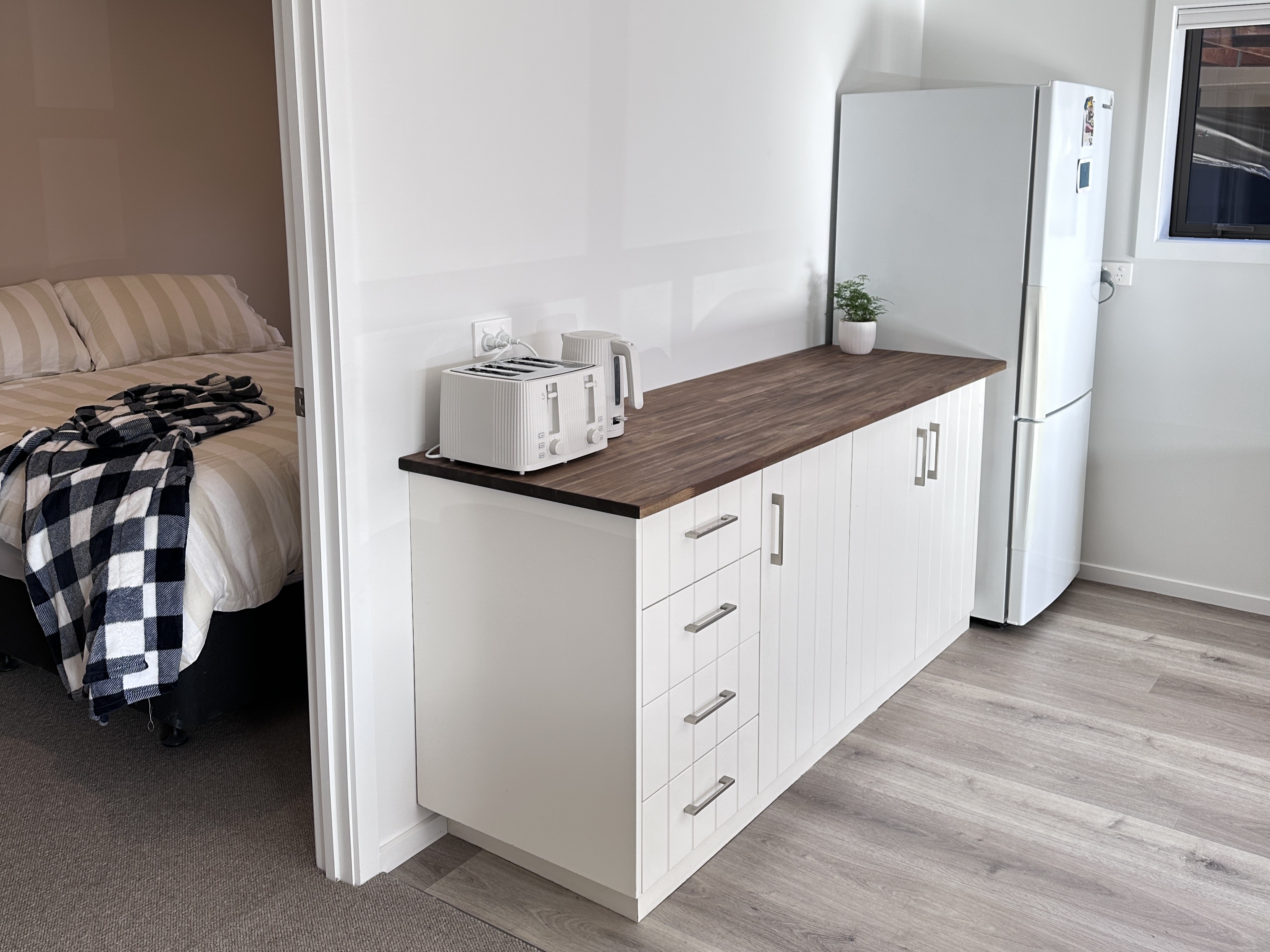 The decision to move the hot water cylinder into a new linen closet enabled the old pump location to be moved out of the existing bathroom. This freed up the space to be ample room for the toilet, large vanity and1200mm wide shower. Meaning that the space is generously proportioned for family use. The two oversized bedrooms of the original footprint were reconfigured into two smaller guest rooms, plus a children’s bunk room and a small storage room. The original garage became the central hub with a living room and some kitchen cabinetry and fridge so that this space could become a casual breakfast bar.