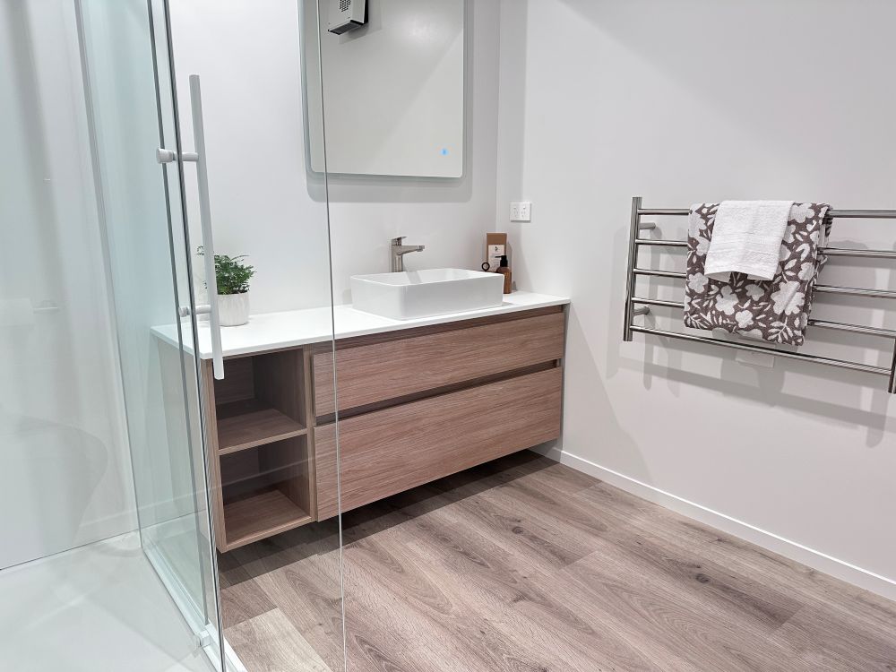 One of the biggest challenges was determining how to cater to the bathroom changes (such as adding a new toilet fixture). The existing setup required a pump to remove the bath wastewater. The Refresh team came up with a solution to move the existing hot water cylinder into a new linen storage cabinet and then utilise the old hot water cylinder cavity to dig down and create space for a new sani-pump capable of handling all the new bathroom fixtures. Most of the original construction was concrete block walls alteration to those walls was kept to a minimum to reduce costs but a new window penetration needed to be created. Some of the existing ceilings were kept in place but due to the age of the house there were a lot of items that had shifted and settled from the original build. To ensure that all of the wall to ceiling junctions looked great a coving was added rather than doing the move contemporary square stopped finish.