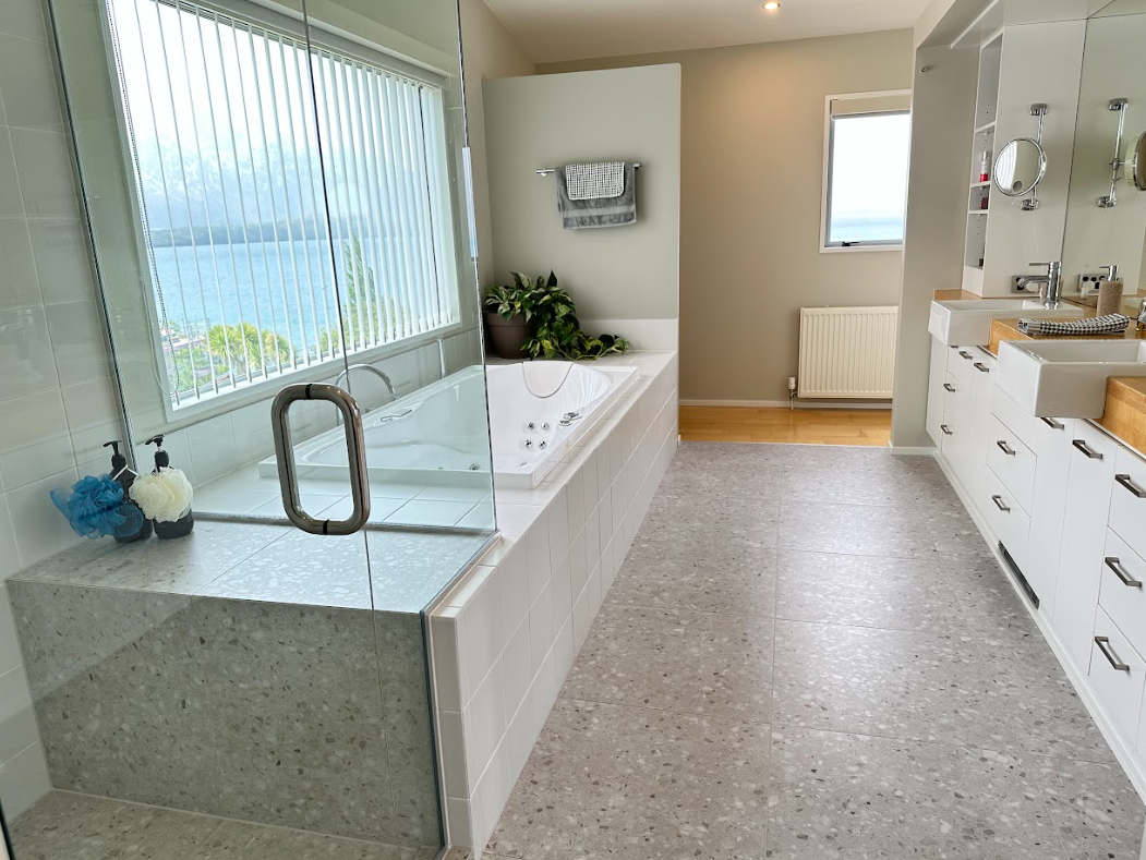 The renovation was completed in 13 weeks for all three spaces, The homeowners were in residence throughout the construction period meaning that one bathroom was always kept operational. Pressure was put on the schedule due to some unexpected issues. The flush finish for the master ensuite bathroom required more work than anticipated. Plus, the additional floor preparation works in one of the guest bathrooms meant that the project was delayed due to a high demand period on trades. However, the Refresh team was able to pull this unexpected setback forward earlier than originally advised. The original budget for the project was $80,202. The final budget for this project was $142,015. This was due to a combination of multiple factors that all added up. These were a mix of unforeseen works such as additional floor modification and preparation works combined with extra requests and upgrades such as reorientation of spa bath access, mitring the tile joins, extending the amount of tiling in the bathrooms, electrical upgrades and changes and a plaster repair and re-paint of the entire multi-level home.