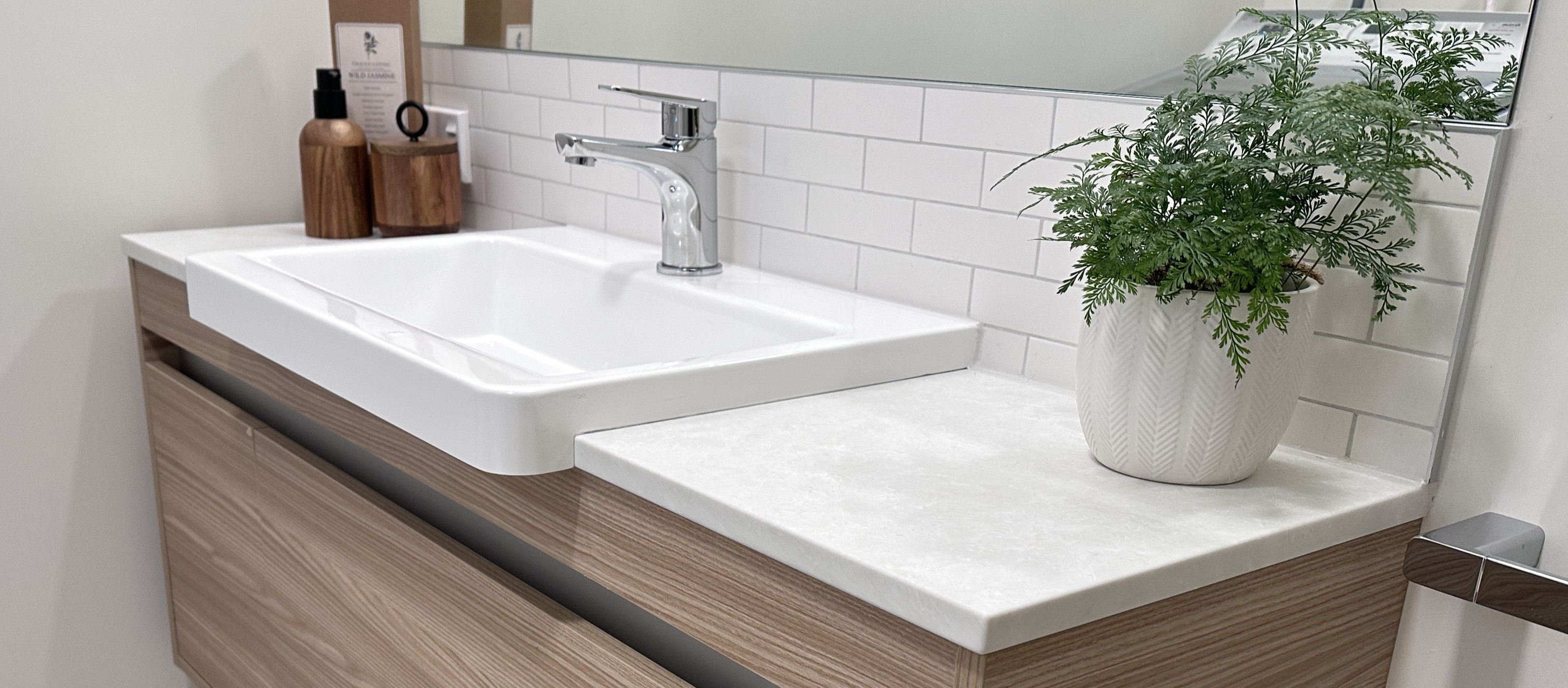 A clean linear look was crucial for this design. By aligning the large mirror to the length of the vanity and adding a splashback of minisubway tiles. It helps elongate and open up the space. The combination of drawer and door storage in the vanity serves to reduce the vertical clutter from the original space. The solid surface vanity top and rimless toilet ensure that these new fixtures not only look great but are easy to keep clean too.