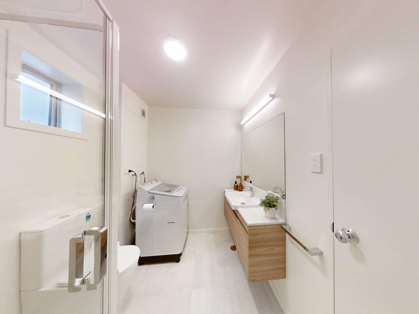 Removing the divider wall from the washing machine helps open up the space and makes it feel bigger without being so closed in. Also moving the storage from wall shelving into the vanity opens the way for a large mirror which also helps the room feel larger than it is. The slimline vanity is paired with a full-sized basin. This configuration allows for a combination of storage and functionality while still being “right-sized” for the proportions of theroom. The colour palette was kept very neutral with warm whites and grey contrasts with the timber look vanity to introduce a needed warmth into the space.