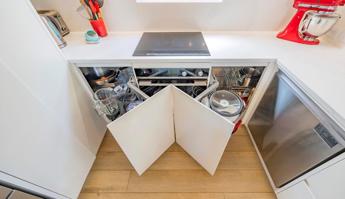 Kitchen: In the kitchen, innovative storage solutions were a must. Pull-out fittings were installed to access tricky corner spaces, making the small area highly functional without sacrificing style.