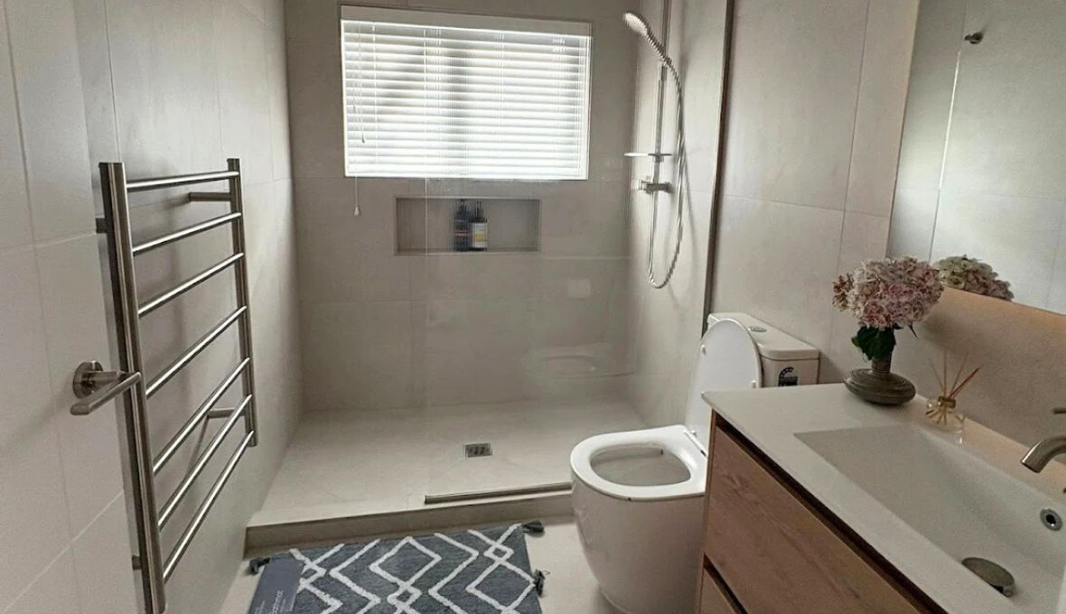 One of the major design decisions was to remove the bathtub and replace it with a wall-to-wall walk-in shower. This allowed the bathroom to feel larger and more open while still meeting the client’s functional needs. Selections for fixtures, fittings, tiles, and finishes were finalised early to avoid delays later in the process.
