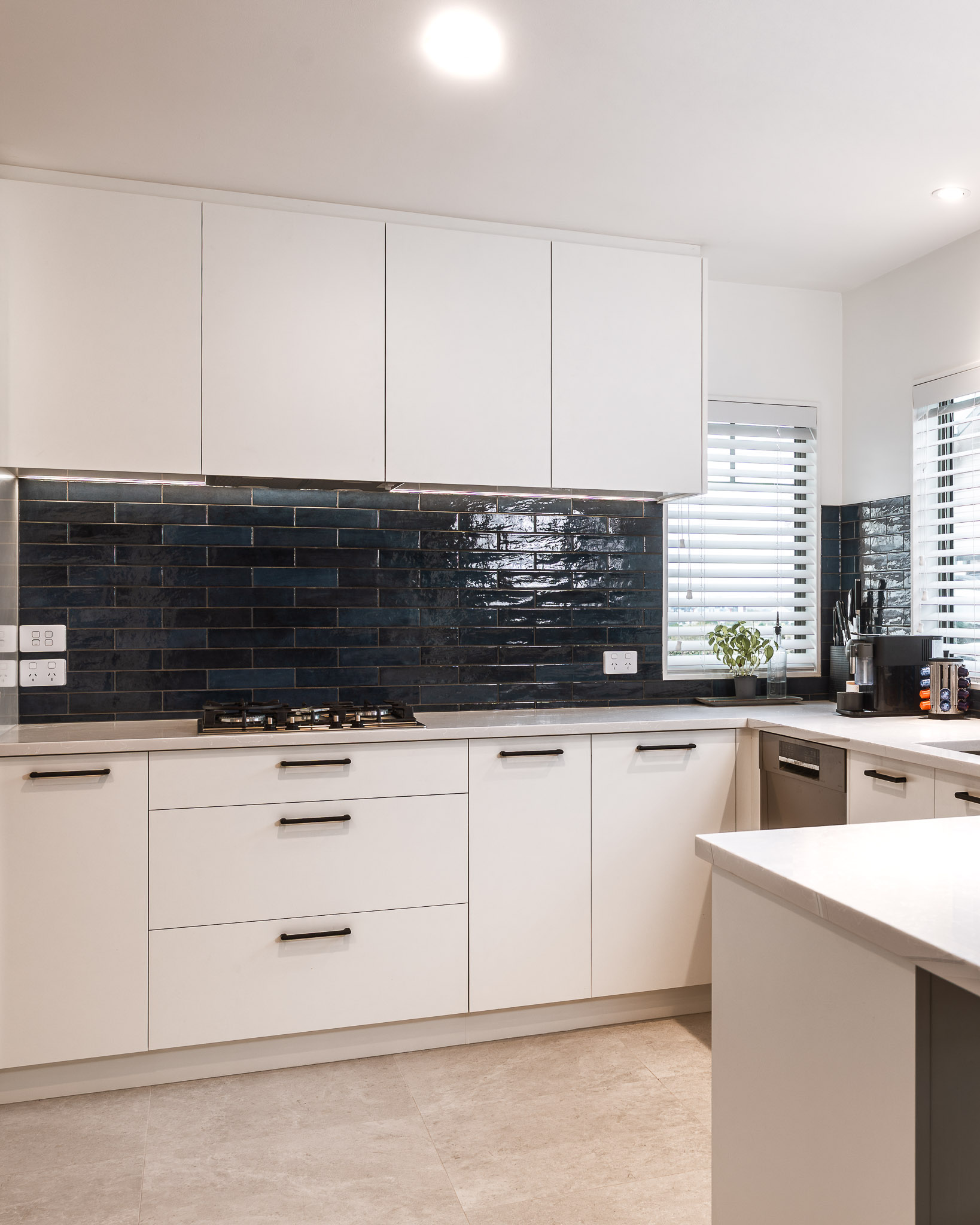 - Bold finishes (e.g. navy cabinetry, wood + stone combinations)